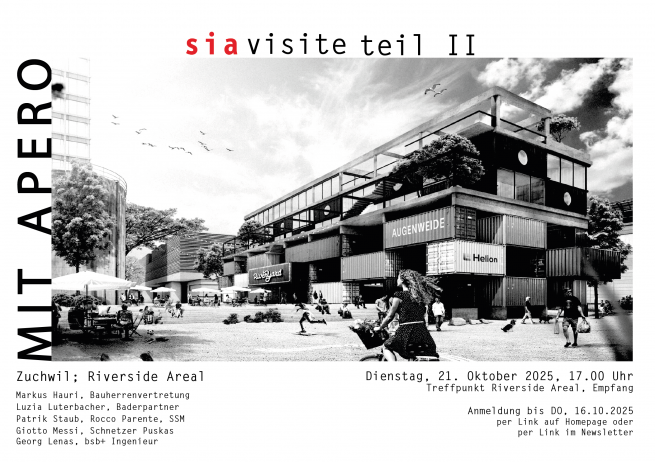 Durch die Visite führen uns von der Architekturseite beim Riverlab Luzia Luterbacher von Baderpartner und beim Holzbau Living II Patrik Staub mit Rocco Parente von ssm. Begleitet werden wir zudem von Markus Hauri, Bauherrenvertreter (Swissprime) mit Georg Lenas von bsb+ Ingenieur (Living I, II und Riverlab) und Giotto Messi, Schnetzer Puskas, Ingenieur Riverlab.